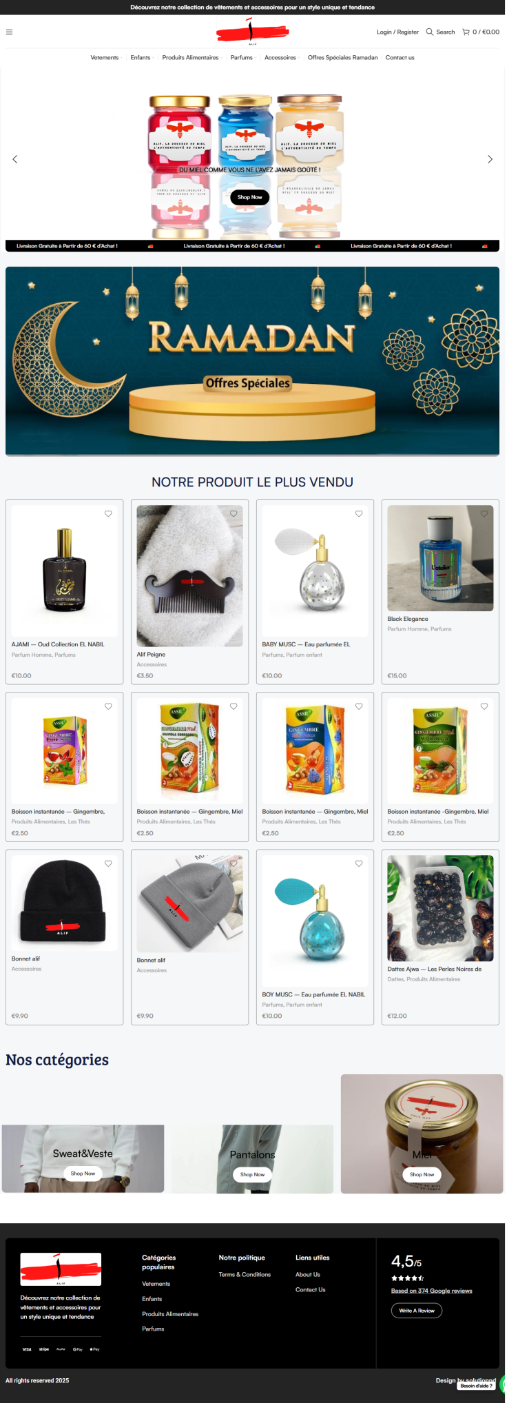 Ce projet consistait à développer une boutique e-commerce spécialisée dans la vente de produits d’épicerie, de vêtements et d’articles religieux (duas, livres, accessoires islamiques, etc.). L’objectif était de créer une plateforme intuitive et performante pour offrir une expérience d’achat fluide et sécurisée.